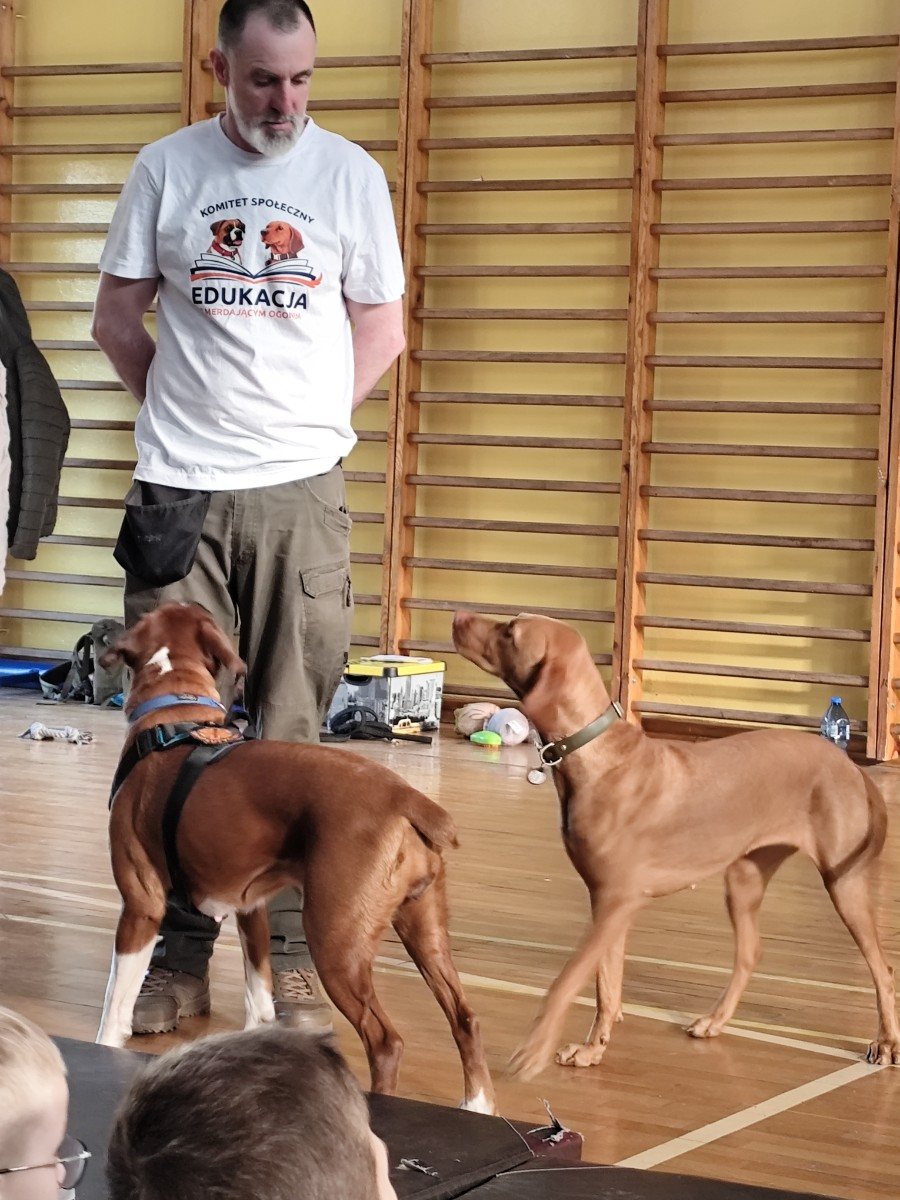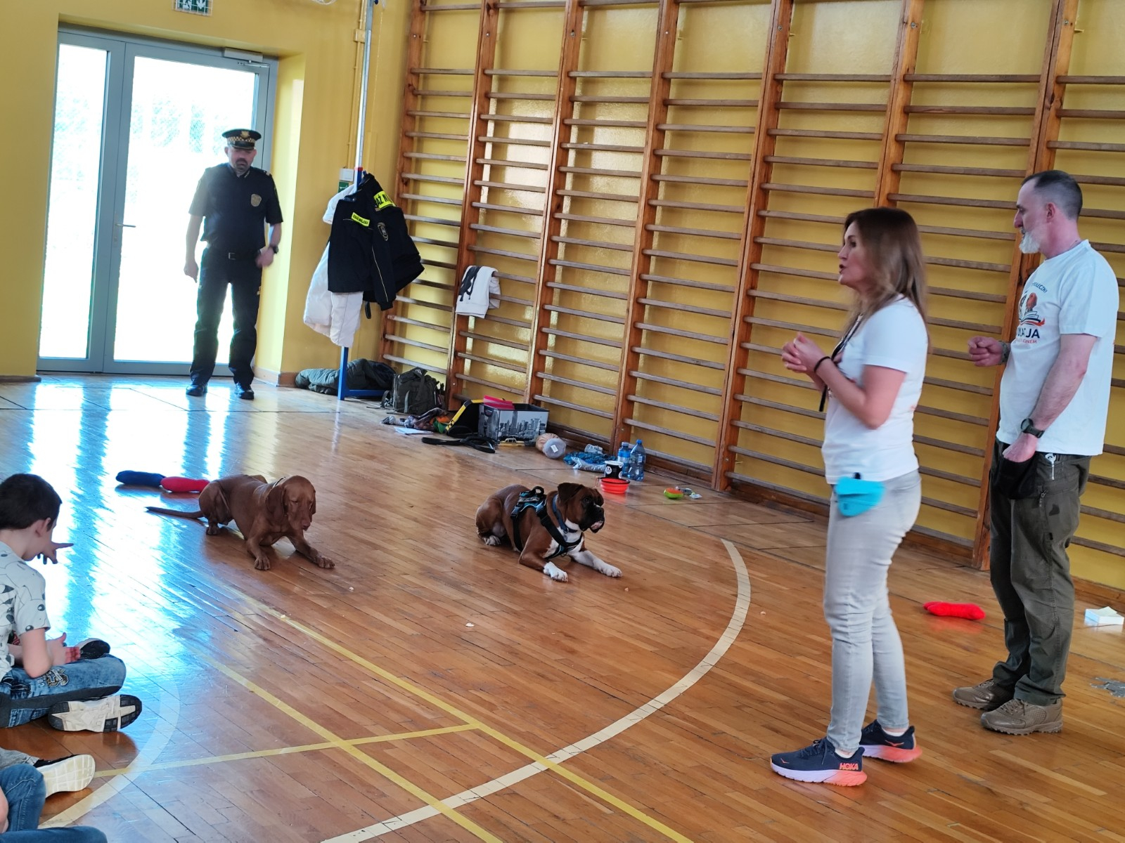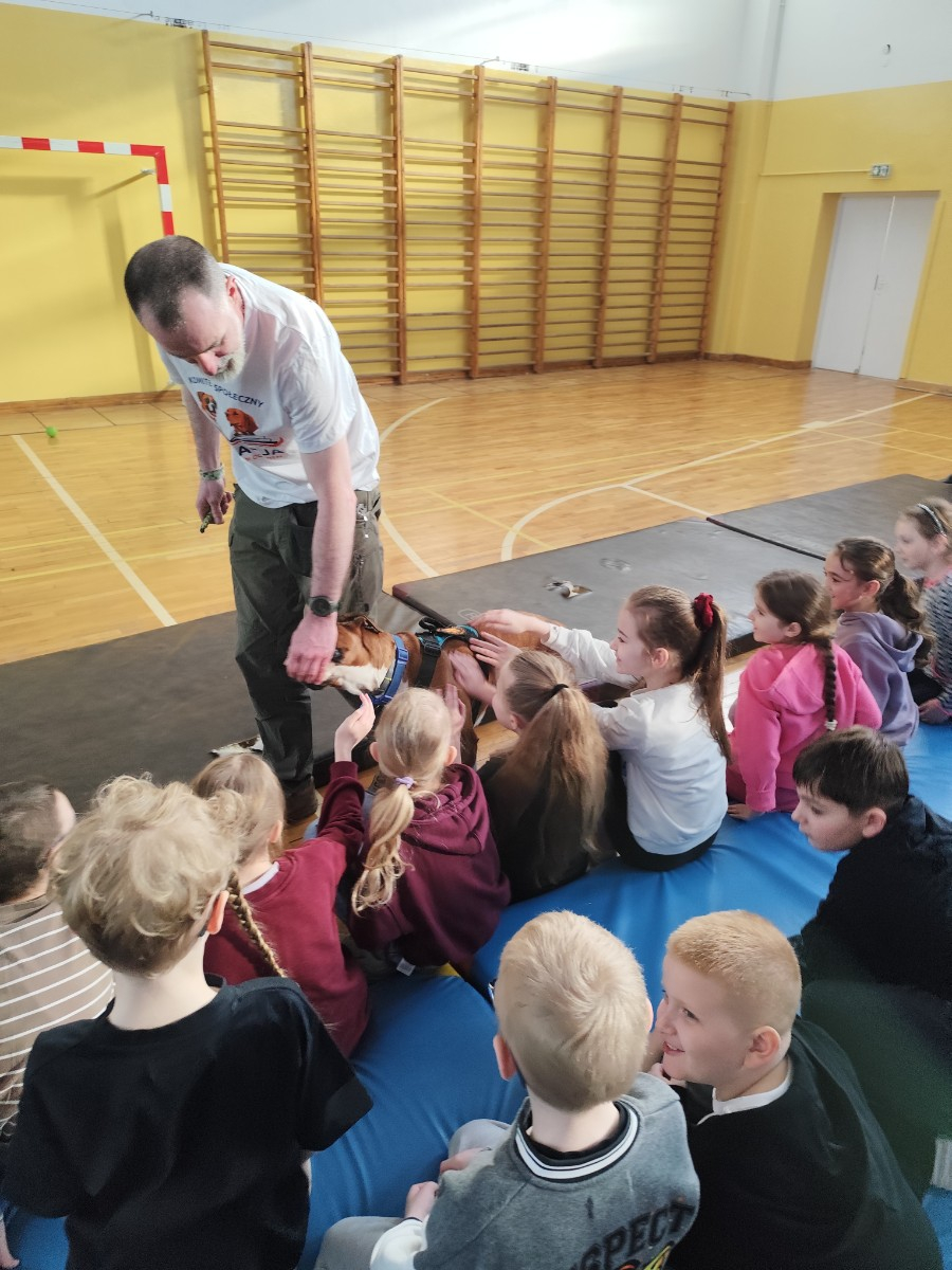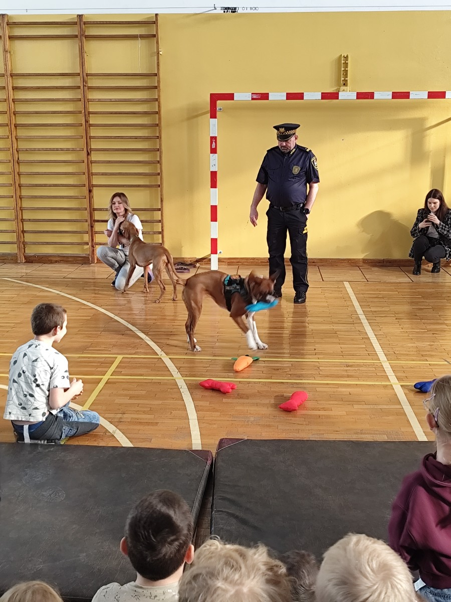 4 marca uczniowie klasy 2 i 3 mieli przyjemność uczestniczyć w spotkaniu z Panią Małgosią i Panem Witkiem, którzy przedstawili ambasadorki programu Edukacja z merdającym ogonem – Ajrę i Sonię. Podczas spotkania dzieci przypomniały sobie zasady zachowania podczas spotkania z psem. Z zaciekawieniem oglądały oba psiaki, które prezentowały swoje umiejętności i posłuszeństwo wobec swoich właścicieli. W spotkaniu uczestniczył również Pan Piotr Demko – zastępca komendanta Straży Miejskiej, który poinformował uczestników o obowiązkach właścicieli psów.