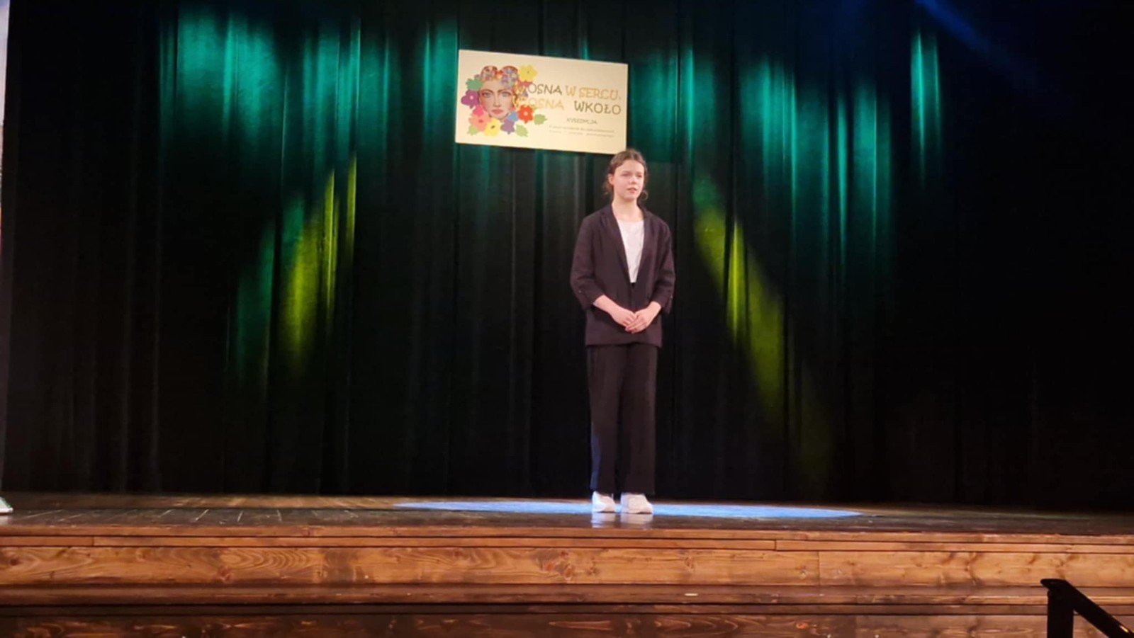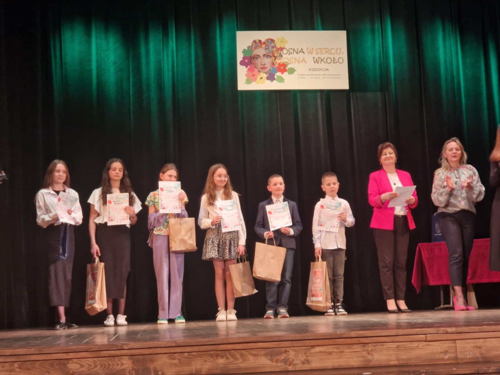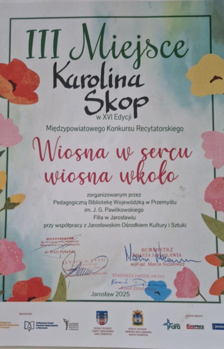 Karolina Skop z klasy 6b, Lena Baran zajęła klasy 7b, Wiktoria Tuczapska i Szymon Tuczapski z klasy 7a reprezentowali naszą szkołę w XVI Międzpowiatowym Konkursie Recytatorskim "Wiosna w sercu,wiosna wkoło".Przesłuchania odbyły się 16 kwietnia br. w Jarosławskim Ośrodku Kultury i Sztuki, a ich głównym organizatorem była Pedagogiczna Biblioteka Wojewódzka Przemyślu Filia w Jarosławiu. Karolina Skop i Lena Baran zdobyły III miejsce, natomiast Wiktoria Tuczapska otrzymała wyróżnienie.