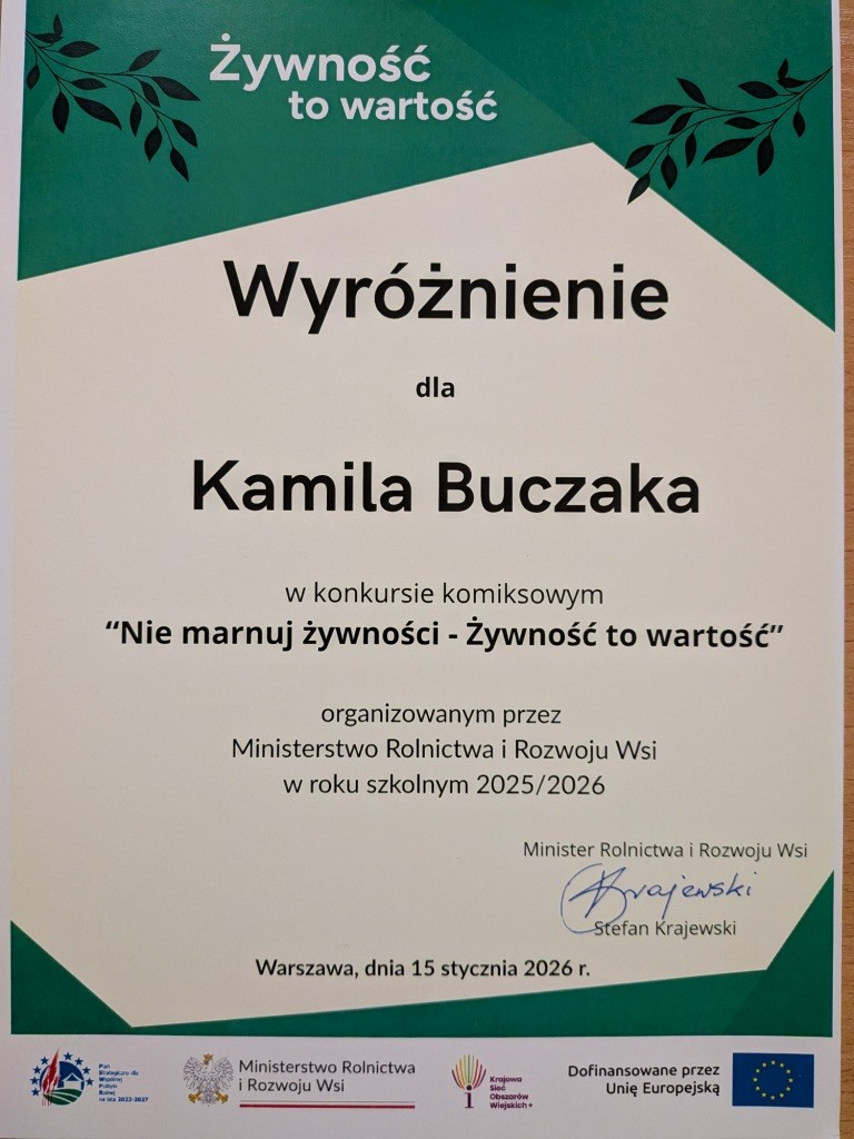 Kamil Buczak, uczeń klasy 7c, otrzymał wyróżnienie w ogólnopolskim konkursie komiksowym „Nie marnuj żywności - Żywność to wartość”, organizowanym przez Ministerstwo Rolnictwa i Rozwoju Wsi.