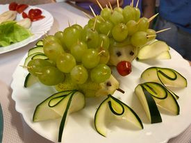 Ważnym elementem tej imprezy były warsztaty z carvingu (dekorowanie stołu ozdobami z warzyw), które prowadzili uczniowie z ZSSiB w Jarosławiu. Przygotowali Oni również pokazowy stół z odpowiednią zastawą i przekazali uczniom naszej szkoły praktyczną wiedzę, wyjaśniając do czego służą konkretne elementy zastawy.