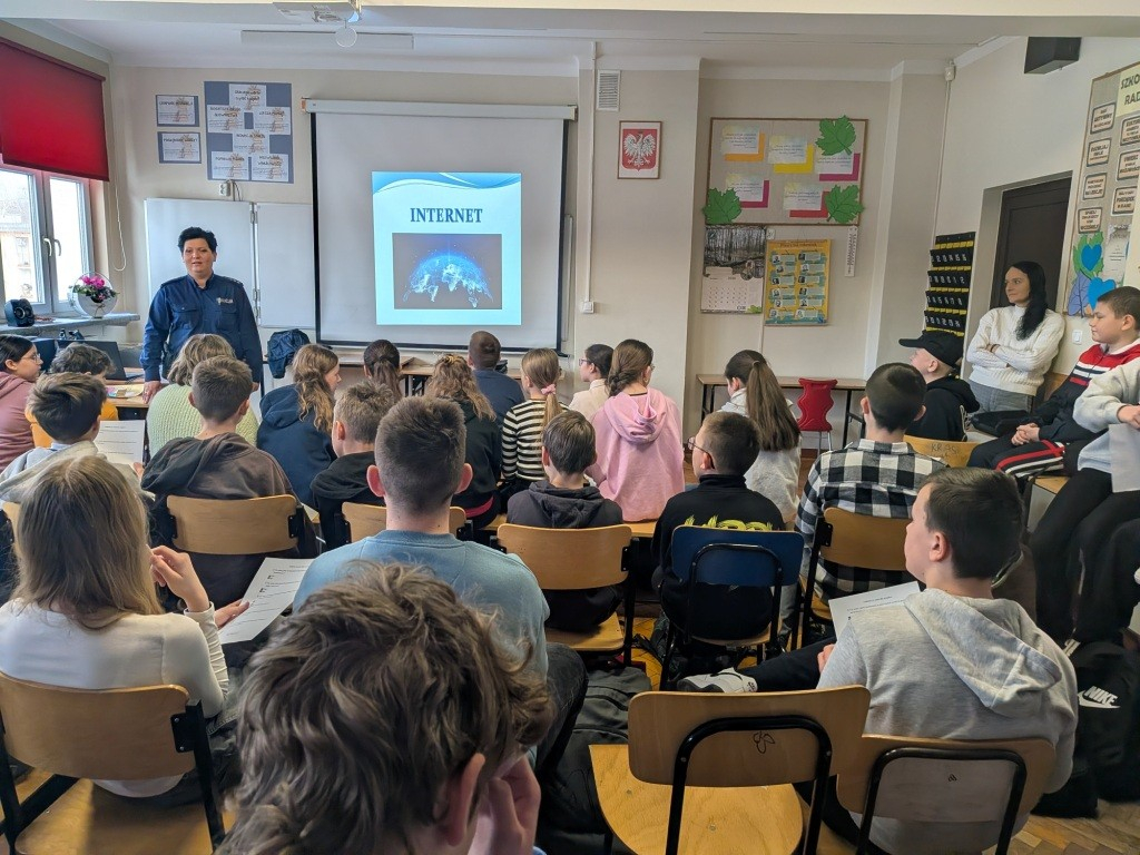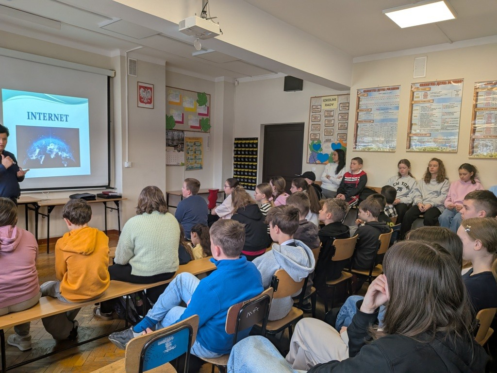 17 marca 2026 r., w ramach obchodów Dnia Bezpiecznego Internetu, w naszej szkole odbyło się spotkanie profilaktyczne z funkcjonariuszkami Policji. W wydarzeniu uczestniczyli uczniowie klas IV–VIII oraz uczniowie z Samorządu Uczniowskiego.