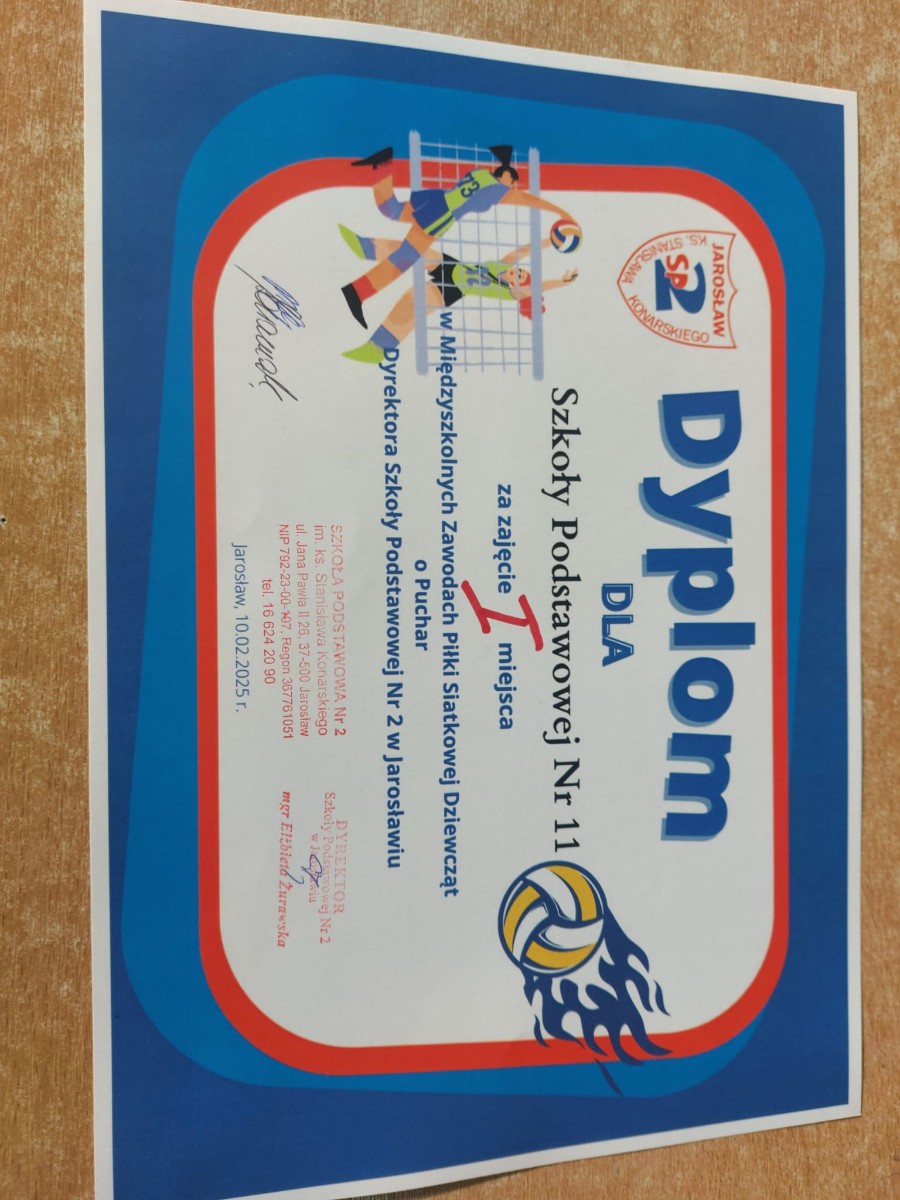 W dniu 10.02.25r. odbyły się miejskie zawody piłki siatkowej o Puchar Dyrektora Szkoły Podstawowej nr 2 w Jarosławiu w ramach Igrzysk Młodzieży Szkolnej. Reprezentacja dziewcząt klas VII-VIII z naszej szkoły zaprezentowała się znakomicie i zdobyła I miejsce . Drużyna wygrała wszystkie mecze: z zawodniczkami z SP nr 2 - 2:0, z SP nr 1 - 2:0 i SP nr 4 - 2:1. Oto szczegółowa punktacja: SP nr 11- SP nr 2: I set - 25:16 II set - 25:10 SP nr 11- SP nr 1: I set - 25:16 II set - 25:16 SP nr 11 - SP nr 4: I set - 14:25 II set - 25:19 III set - 15:12