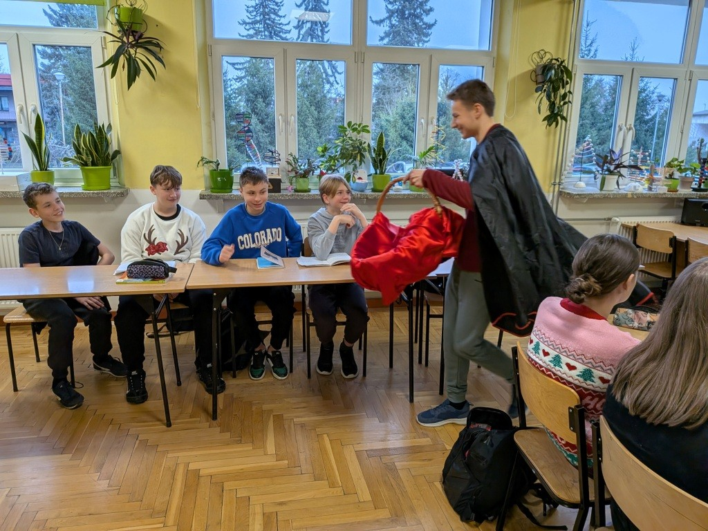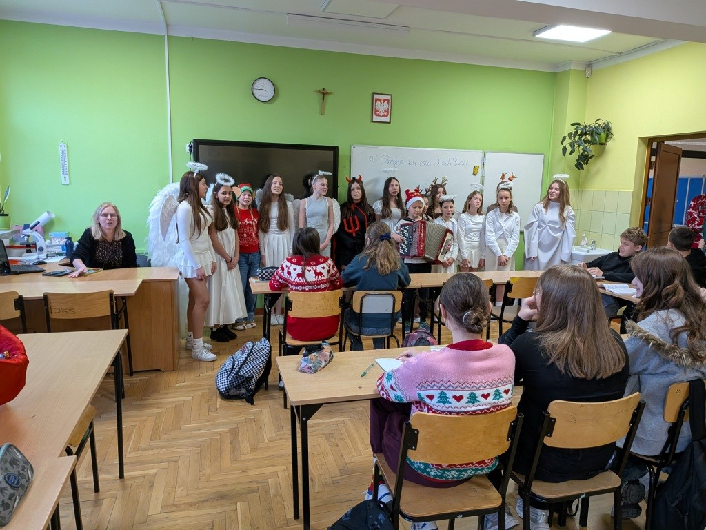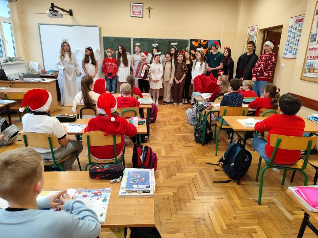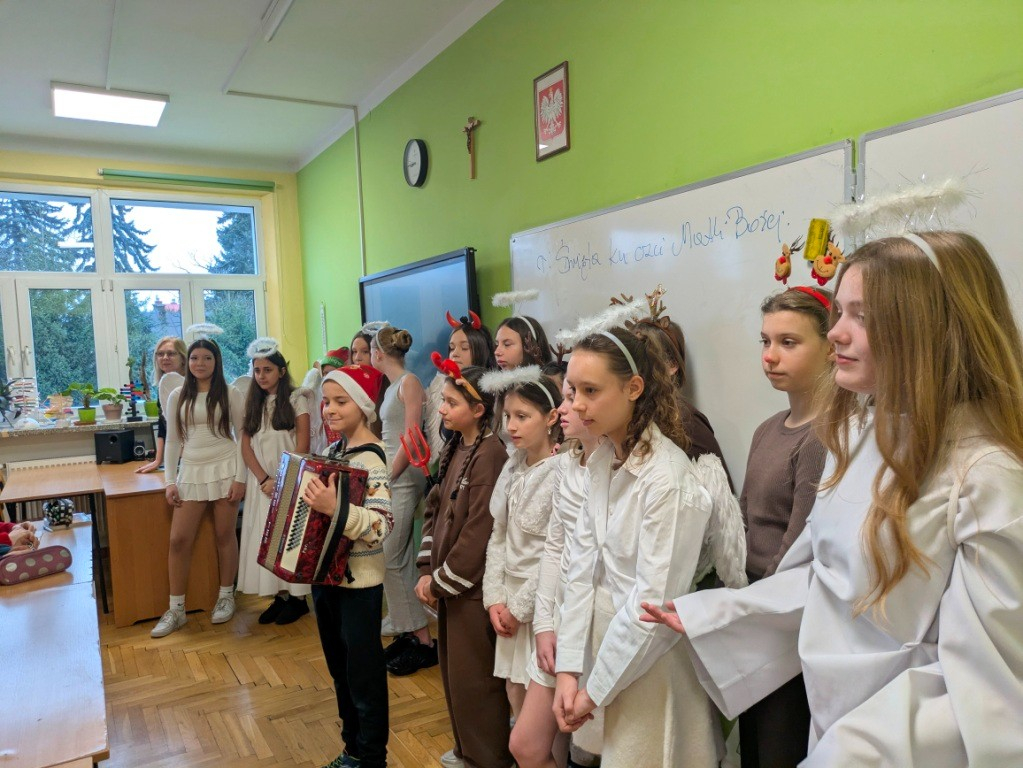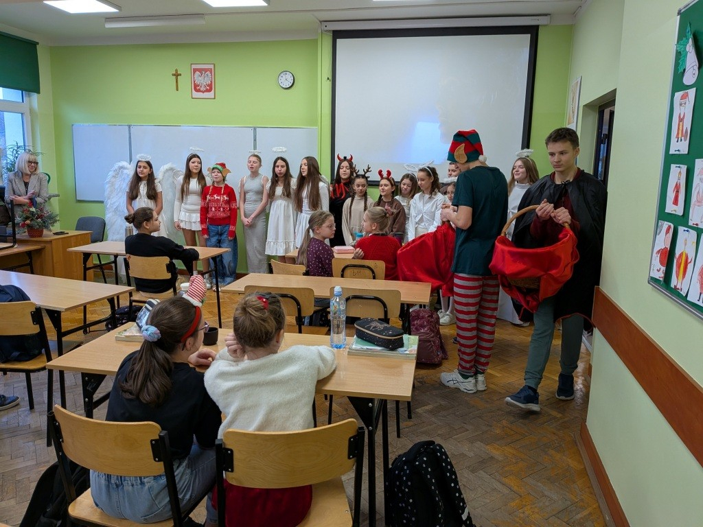 5 grudnia 2025 roku naszą szkołę odwiedziła liczna grupa pomocników Świętego Mikołaja ze słodkim poczęstunkiem. Świąteczny nastrój udzielił się każdemu, a radość wspólnego śpiewania przy dźwiękach akordeonu trwała przez cały dzień.
