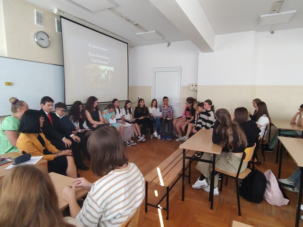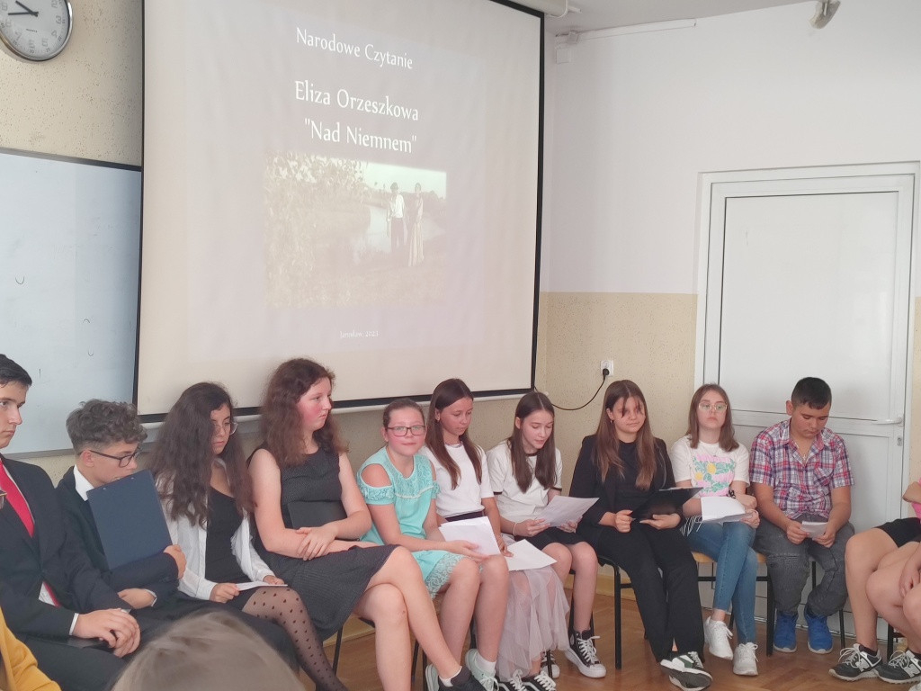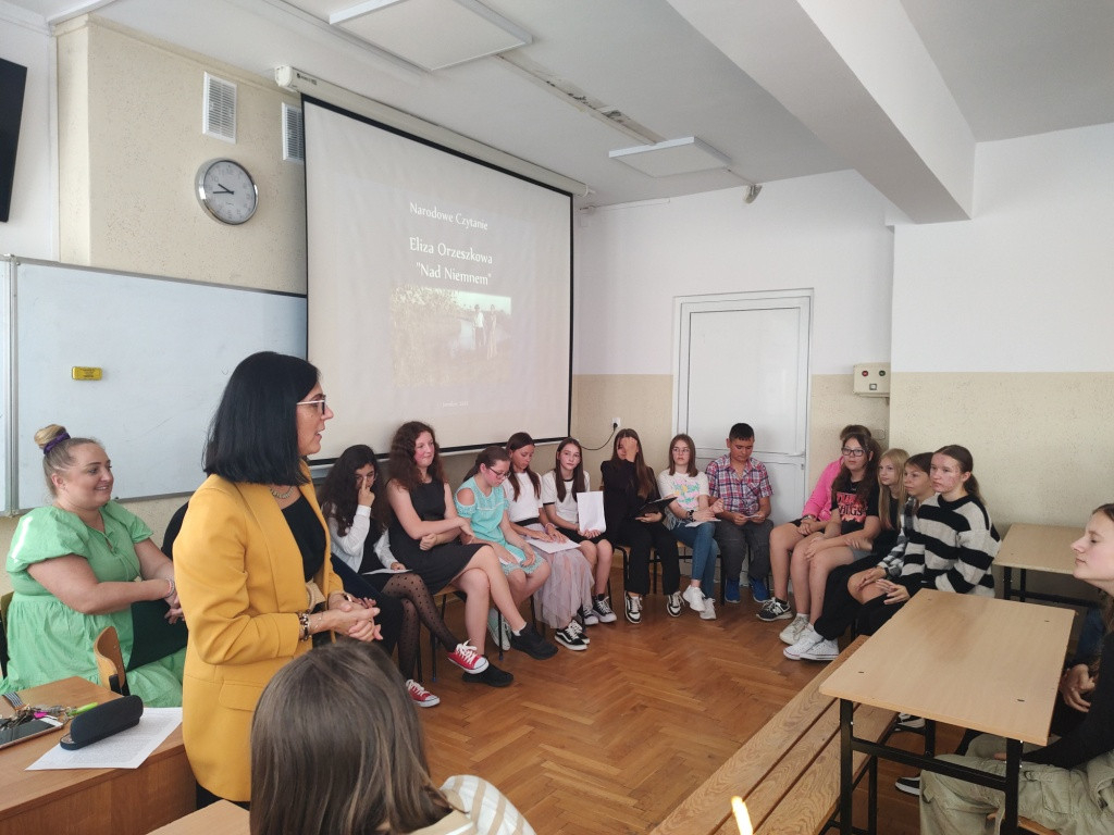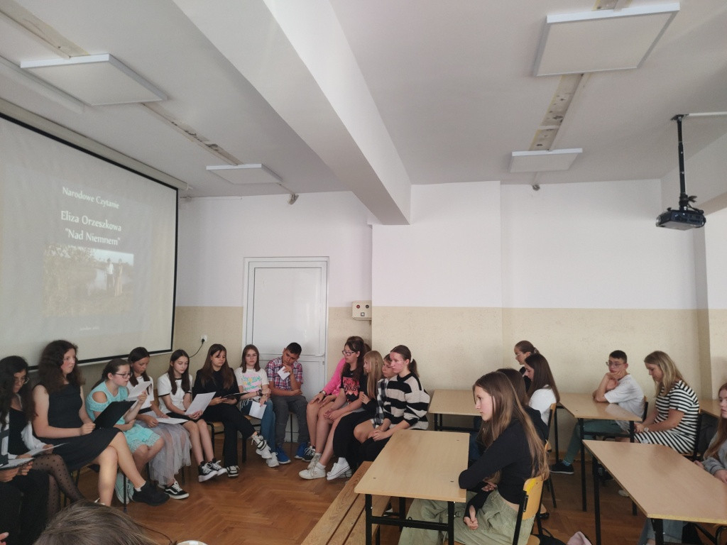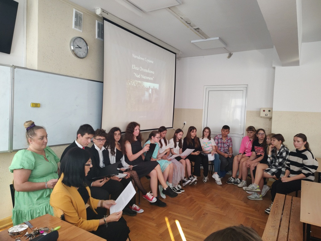 Narodowe Czytanie to ogólnopolska akcja wspólnego czytania największych dziel literatury polskiej.  W piątek (8 września 2023) nasza aktywnie włączyła się w akcję, na czele z Panią Dyrektor Ewą Leniar. Uczniowie starszych klas z zainteresowaniem słuchali fragmentów powieści Elizy Orzeszkowej pt. „Nad Niemnem”,  poznając niezwykłą legendę o Janie i Cecylii.