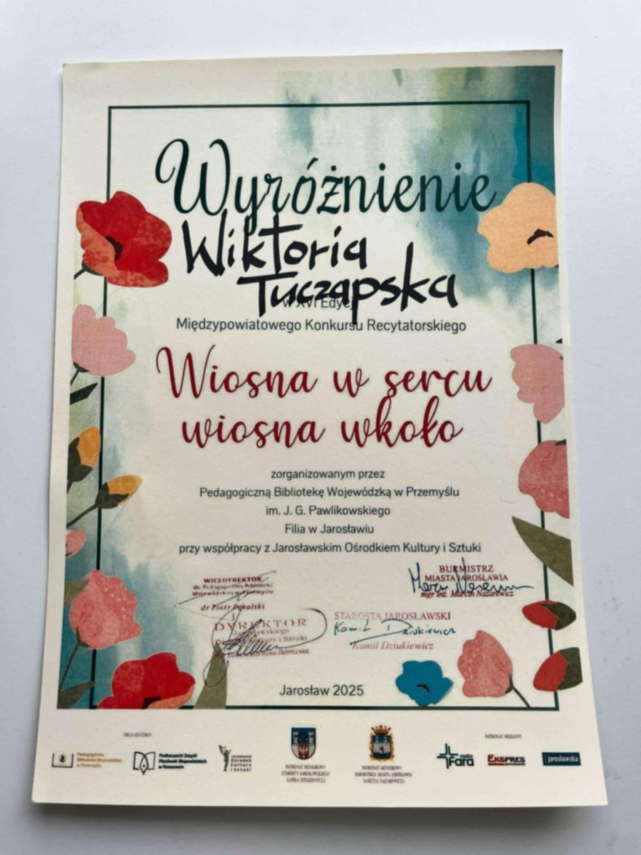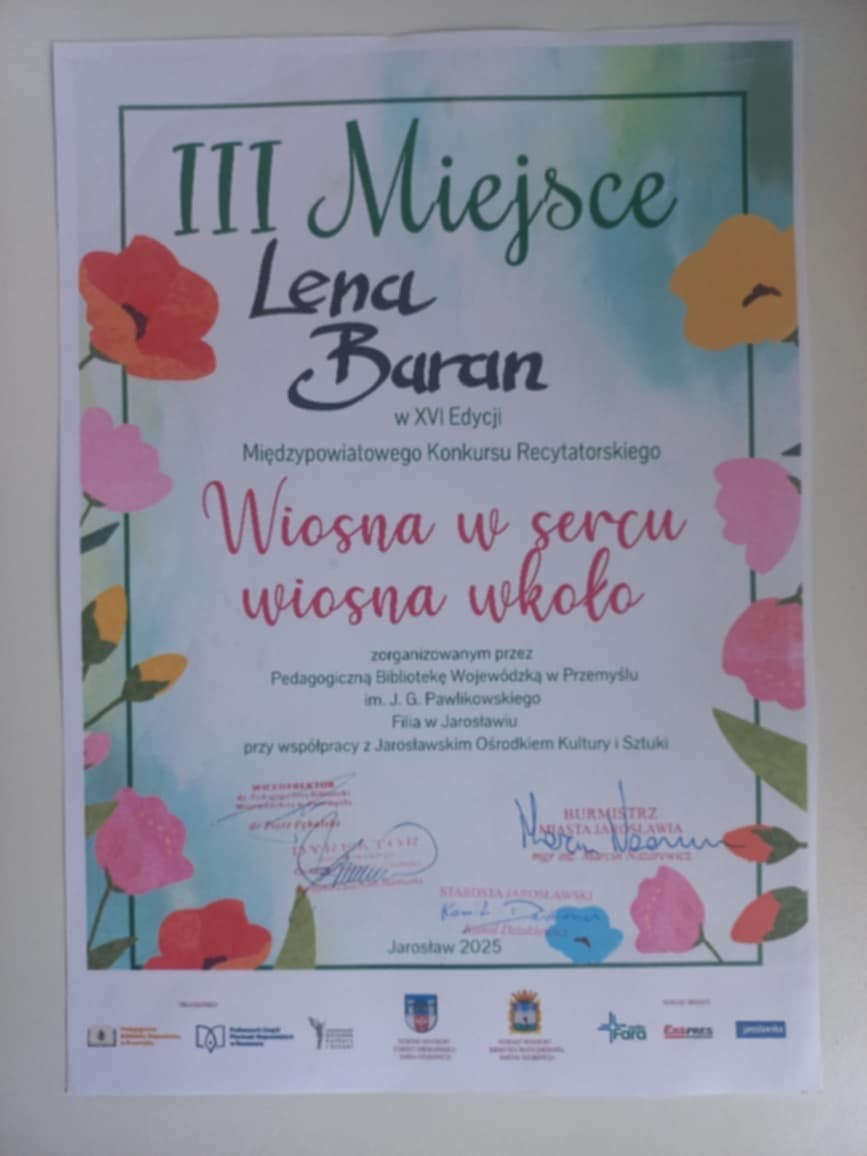 Karolina Skop z klasy 6b, Lena Baran zajęła klasy 7b, Wiktoria Tuczapska i Szymon Tuczapski z klasy 7a reprezentowali naszą szkołę w XVI Międzpowiatowym Konkursie Recytatorskim "Wiosna w sercu,wiosna wkoło".Przesłuchania odbyły się 16 kwietnia br. w Jarosławskim Ośrodku Kultury i Sztuki, a ich głównym organizatorem była Pedagogiczna Biblioteka Wojewódzka Przemyślu Filia w Jarosławiu. Karolina Skop i Lena Baran zdobyły III miejsce, natomiast Wiktoria Tuczapska otrzymała wyróżnienie.
