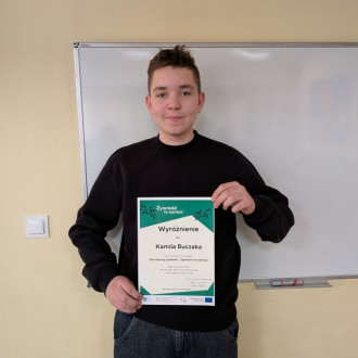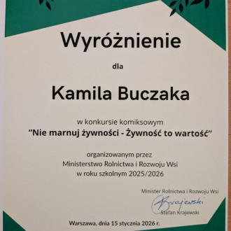 Kamil Buczak, uczeń klasy 7c, otrzymał wyróżnienie w ogólnopolskim konkursie komiksowym „Nie marnuj żywności - Żywność to wartość”, organizowanym przez Ministerstwo Rolnictwa i Rozwoju Wsi.